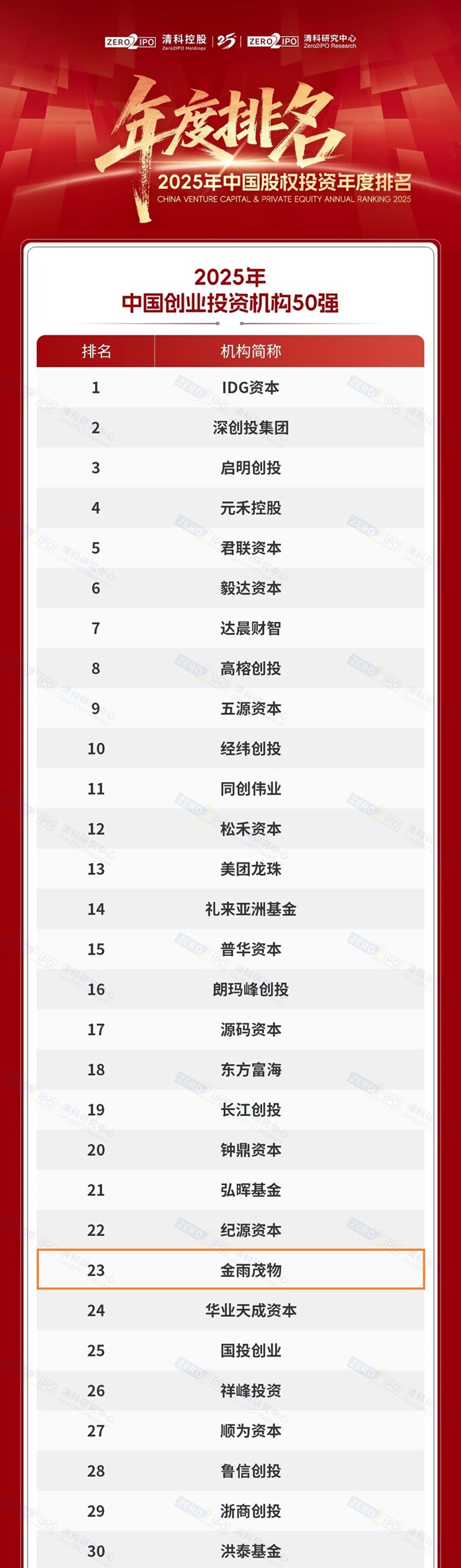 12月29日,备受业界瞩目的清科2025中国股权投资年度排名正式揭晓,金雨茂物凭借扎实的投资业绩实力登榜,荣获中国创业投资机构第23名。